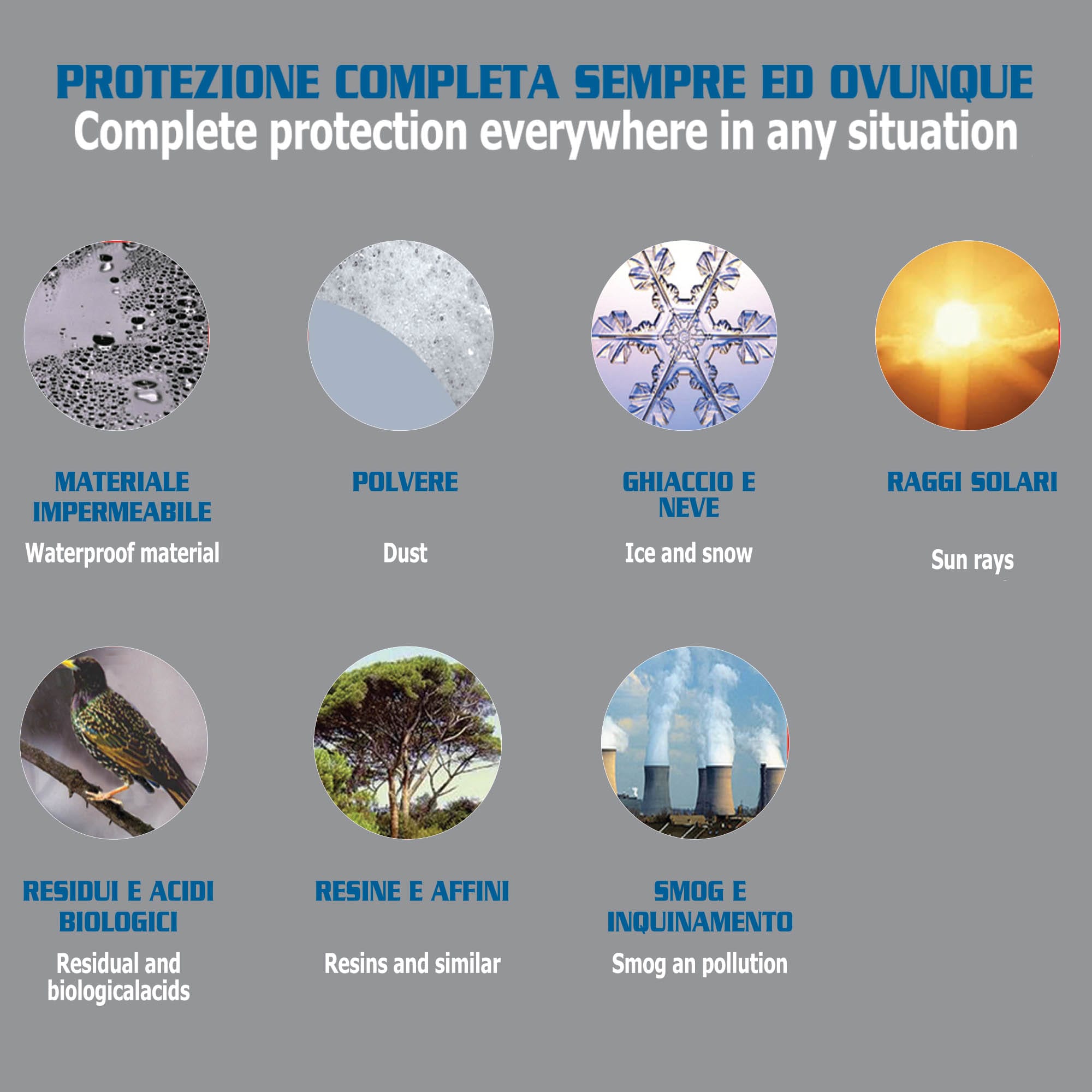 Popolna zaščita povsod v vseh situacijah pred: prahom, ledom in snegom, sončnimi žarki, preostalimi in biološkimi kislinami, smolami in podobnimi snovmi, smogom in onesnaževanjem.