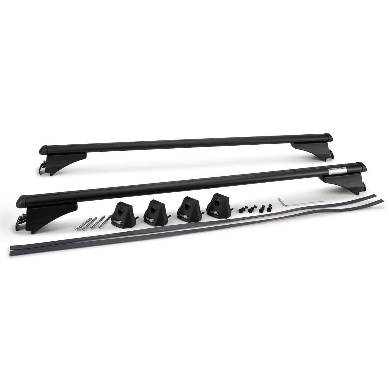 Univerzalni strešni nosilci Menabo Tiger Black 135 cm, črni eloksirani aluminij, za vozila z integriranimi strešnimi sanmi; enostavno in hitro prilegajoče, že sestavljene in pripravljeno za uporabo.